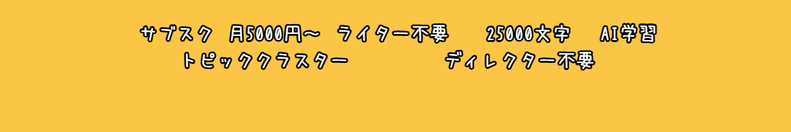 | トピッククラスター 記事 | 15000~ 25000文字 | キーワード1語 | 5000円/記事 | 20000円/記事 | 追加料金無し ・wordpress ・HTMLタグ付ドキュメント | サービス ◯ | ◯ | 無料記事 | ◯ | ◯ 追加料金無し | 「SEOについて知らない」「手間はかけたくない」「ライターへのディレクションの工数をなくしたい」という方 |