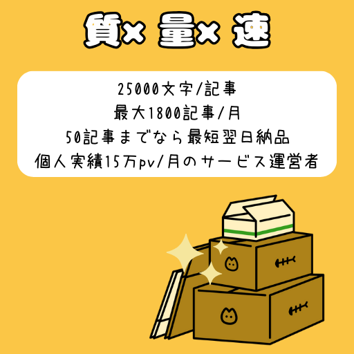 | 単発記事 | 15000~ 25000文字 | キーワード | 5000円/記事 | 20000円/記事 | 追加料金無し ・HTMLタグ付ドキュメント | - | ◯ | - | - | - | 高度なディレクションや記事執筆のシステムが確立しているが、「穴埋め」的な記事が欲しい方へ |